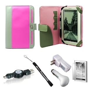 Pink Gray Agenda Lining Leather Flip Jacket Portfolio Cover Carrying Case for Sony PRS-950 Electronic Reader eReader Device ( PRS 950 PRS950 )(Compatible with all colors) + Indlues a 4-Inch Determination Hand Strap + Includes a Anti Glare Screen Protector + 3 in 1 Travel Charger Combo Set includes a Home and Car Charger with a Retractable USB Sync Data Cable for your eReader