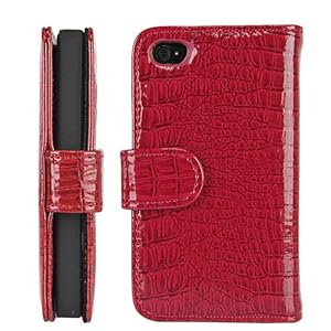 Red Wallet Style Magnetic Flip Textured Crocodile Leather Case with Credit Card / ID Slots for iPhone 4 / 4s (AT;T, Verizon, Sprint)